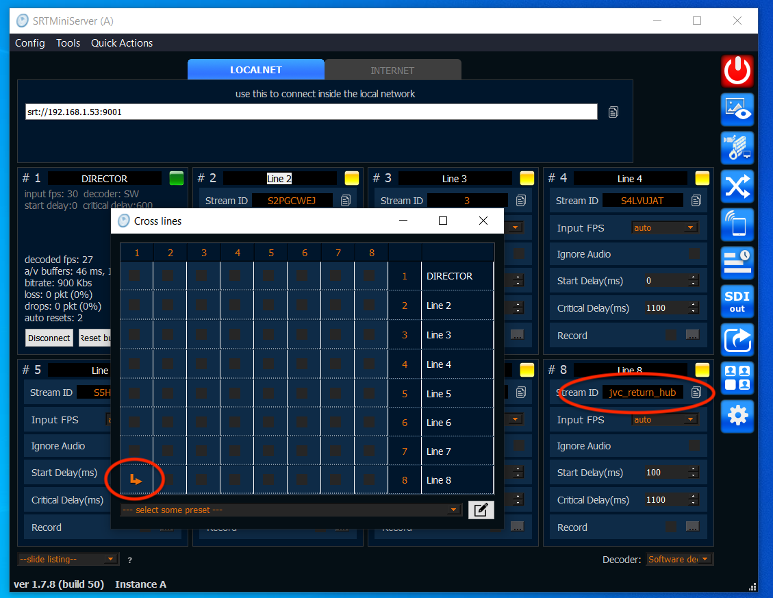 I streamed to Line#1 (called DIRECTOR) from SRTStreamer (you can use any SRT encoder)