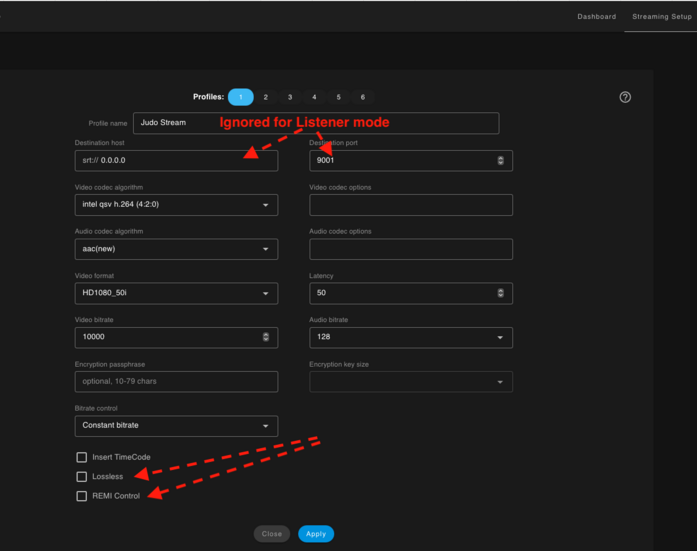 However, please note that some profile fields are ignored in Listener mode and can be filled with any value: