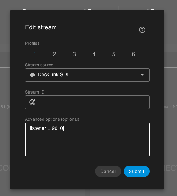 To set the stream to Listener mode, in the "Advanced Options" section, specify the parameter