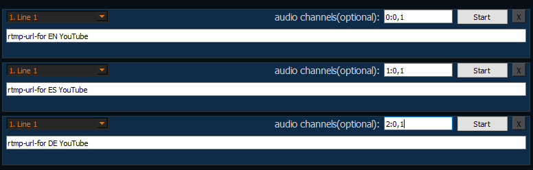 For example, if the input stream has the following channels: 0-English,1-Spanish,2-German then you can send the signal to 3 YouTube channels